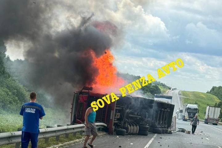 В одном из автомобильных пабликов Пензы появились фотографии, на которых запечатлен большегруз, опрокинутый на бок. Машина объята пламенем.