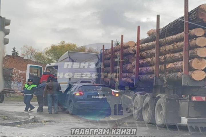 На Перекрестке улиц Долгова и Чехова фура, груженая деревом прижала иномарку к обочине.