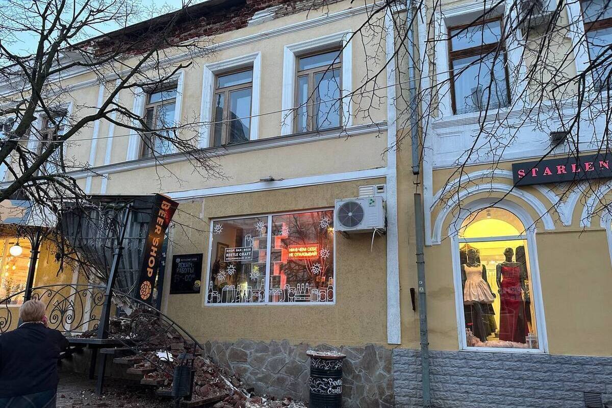 На кадрах с места происшествия видно, что обрушилась часть фасада дома №4. Обломки упали на козырек крыльца магазина разливных напитков, расположенного в этом здании. Конструкция не выдержала натиска – прогнулась и отвалилась от веса кирпичей. Обвалившиеся куски здания разлетелись также по ступенькам и тротуару. Пострадали и вывески магазина.