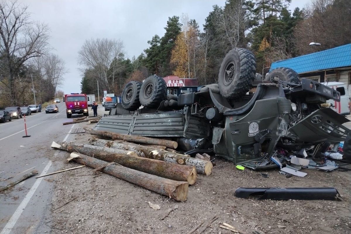 По предварительным данным, водитель грузового автомобиля КАМАЗ не справился с управлением, в результате чего транспортное средство опрокинулось. На место оперативно прибыли пожарно-спасательные подразделения.