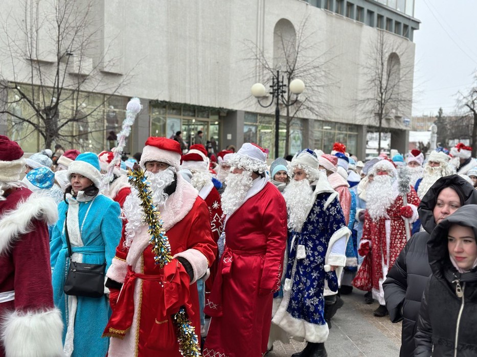 Десятки Дедов в красных и синих кафтанах с длинными белыми бородами прошли по главной улице города.