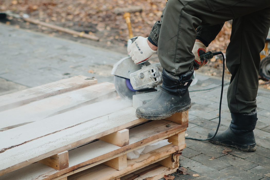 Рабочие меняют плитку в общественном месте. Несмотря на переменчивую осеннюю погоду, работы находятся в активной стадии.