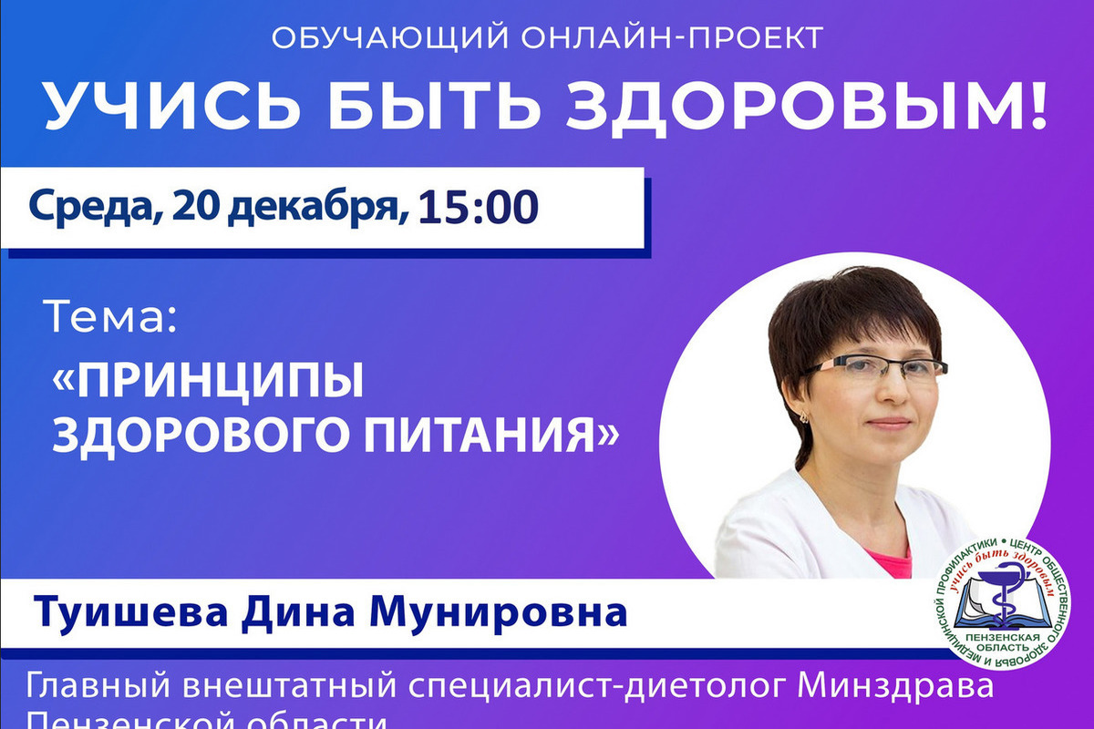 В группе «Пензенская область - территория здоровья» в соцсети «ВКонтакте» объявили о проведении онлайн-трансляции с главным внештатным специалистом-диетологом минздрава Пензенской области Диной Туишевой.
