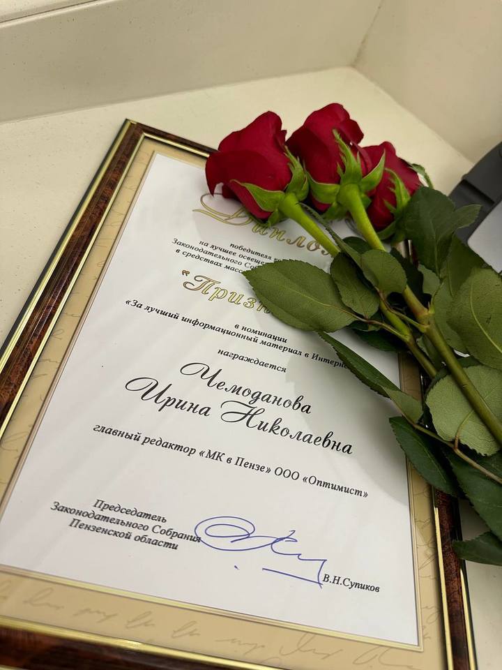 За лучший информационный материал главного редактора «МК в Пензе» Ирину Чемоданову наградили дипломом.