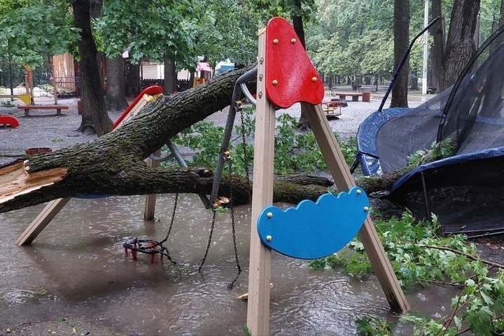 Пострадала также игровая площадка у кафе «Лесное» на Олимпийской аллее. Под ударом от одного дерева деформировались сразу несколько детских аттракционов – качели и батут.