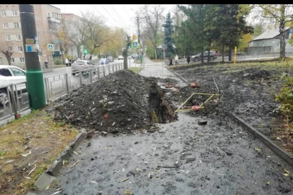 На кадре видно прорытую на несколько метров траншею в асфальте, вокруг которой лежат кучи земли. Прохожим приходится обходить вырытую яму по грязи, которая вызвана как раскопками, так и октябрьской слякотью.