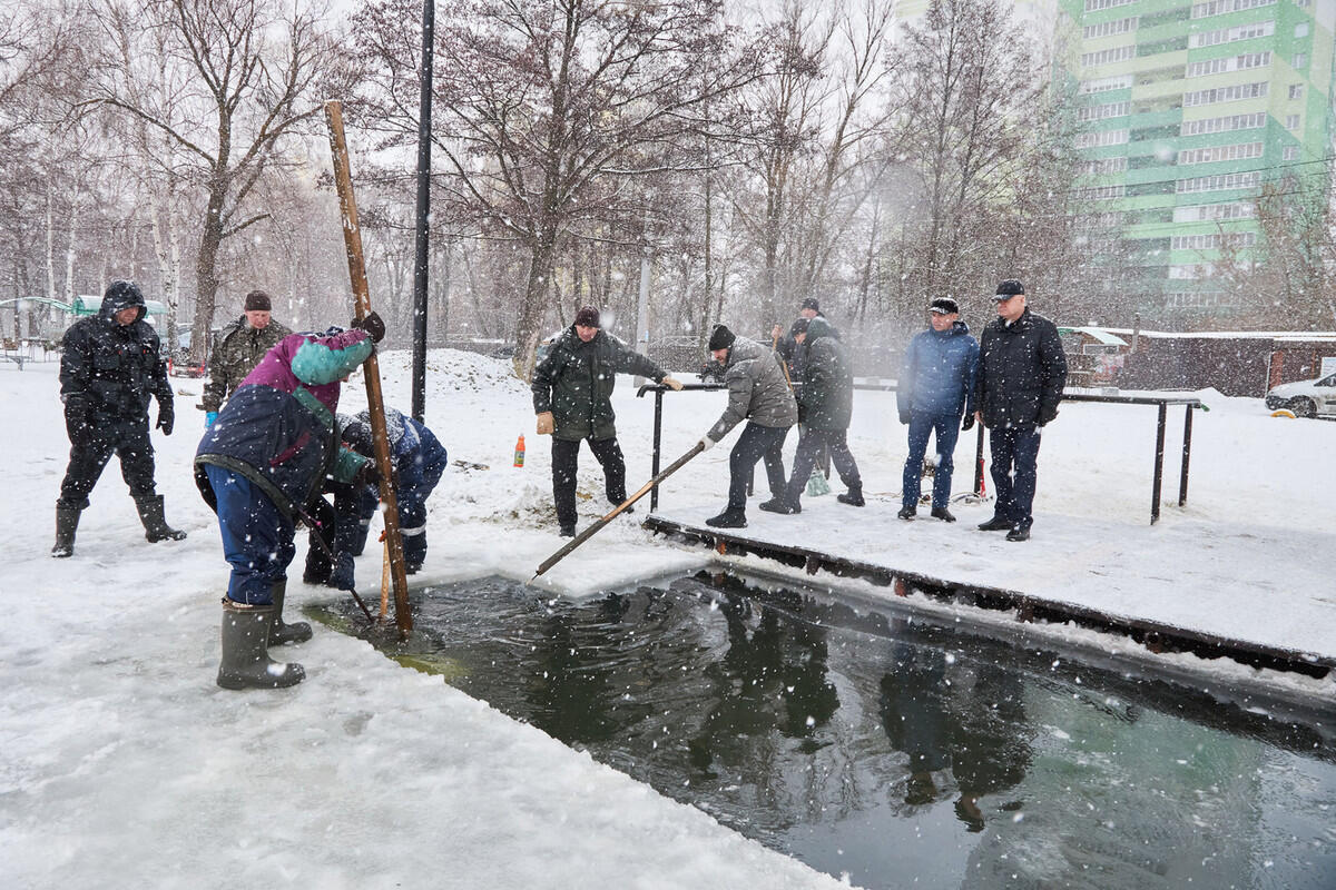 Для проведения крещенских купаний на специально оборудованной площадке вырезана купель и устанавливаются удобные и безопасные ступени, предназначенные для схода в воду. Лед здесь толщиной в 22 см. Купель будет полностью соответствовать требованиям и рекомендациям МЧС.