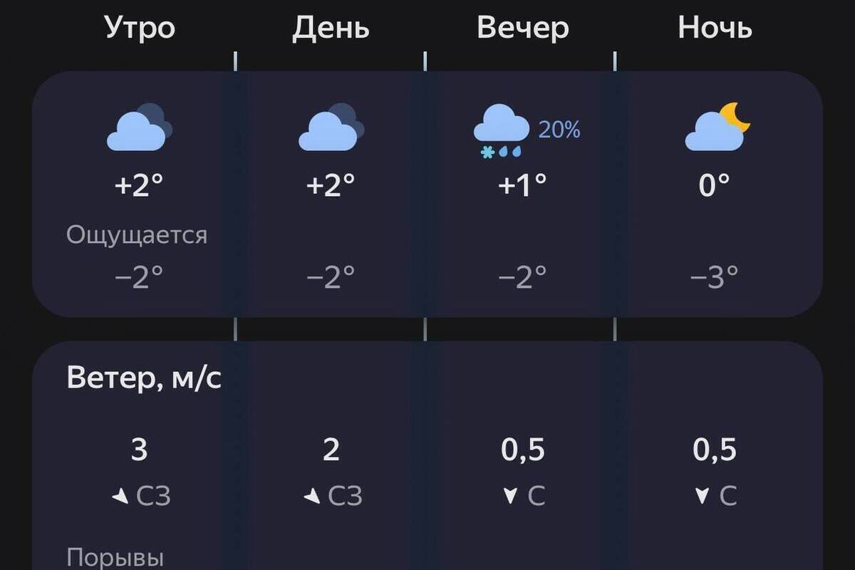 Ветер будет слабым, 1-3 метра в секунду, с возможными порывами до 8 метров в секунду. Осадки в виде снега с дождем прогнозируются преимущественно во второй половине дня. Атмосферное давление останется в пределах климатической нормы для данного времени года.
