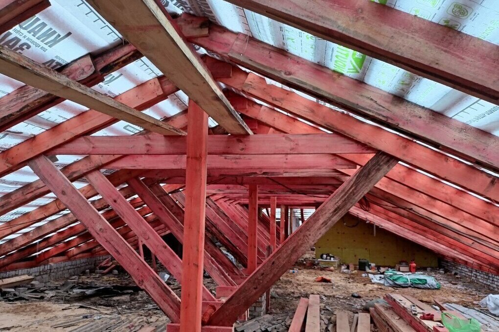 В рамках ремонта полностью заменяется кровельное покрытие. Работы также включают замену стропильной системы, монтаж обрешетки и обработку деревянных конструкций огнестойкими составами для защиты от внешних факторов и повышения безопасности.