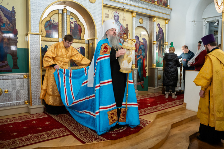 Его Высокопреосвященству в служении помогали: игумен Августин (Зайцев), настоятель Спасо-Преображенского монастыря, архимандрит Пантелеимон (Бондаренко), иеромонах Ириней (Легошин), священник Георгий Насонов, а также диаконы Богдан Яворский, Кирилл Вейго и иеродиакон Иоанникий (Комиссаров).